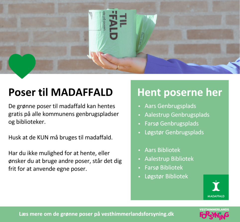 Når du er løbet tør for de grønne poser til madaffald, kan du gratis hente nogle nye på alle genbrugspladserne og på bibliotekerne i Vesthimmerland.
