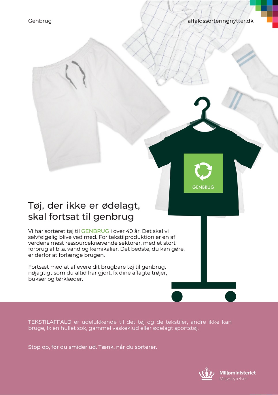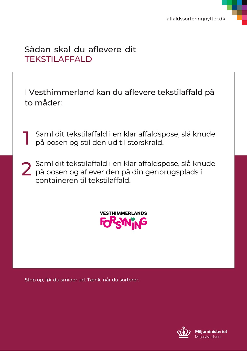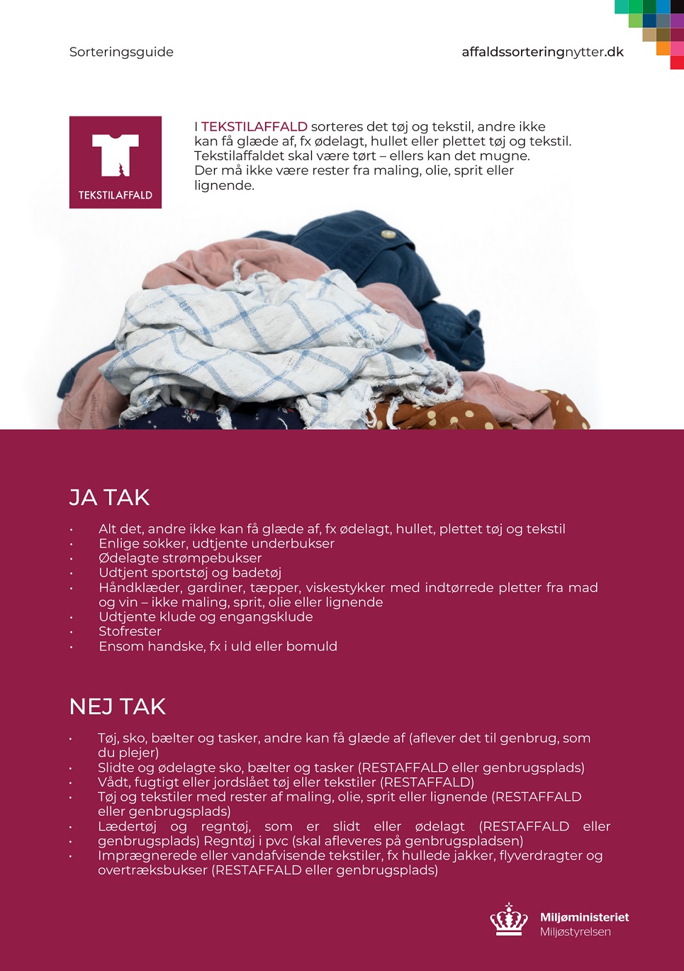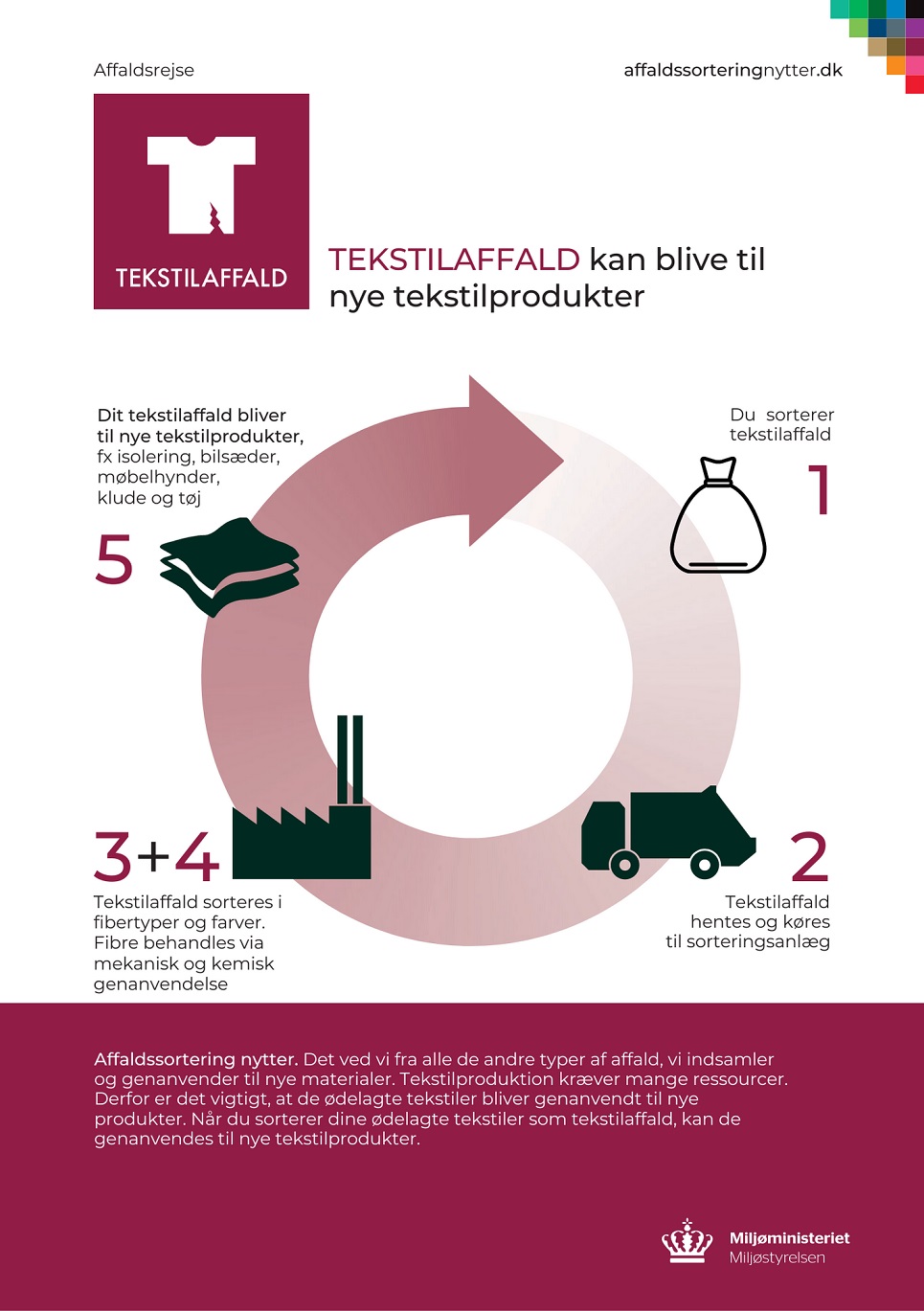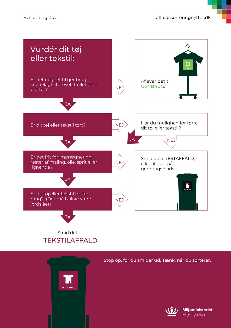 Miljøstyrelsen har lavet en fin lille pjece, der guider dig godt igennem alle spørgsmål vedrørende TEKSTILAFFALD