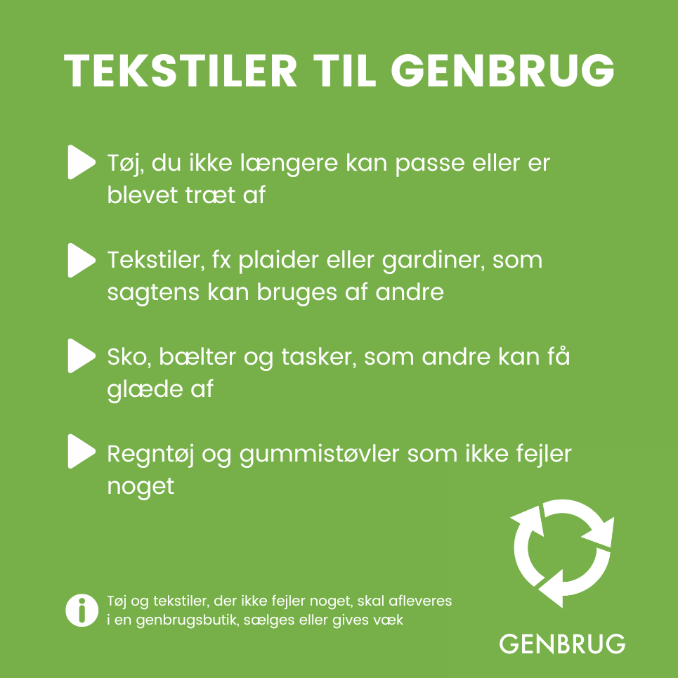 - Tøj til genbrug - altså brugbart tøj som andre kan få glæde af, skal enten gives væk, sælges eller afleveres i en genbrugsbutik.
